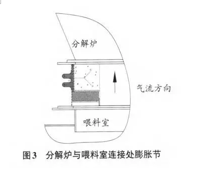(3) 分解爐與喂料室連接處膨脹節(jié) 。 分解爐與喂料室連接處膨脹節(jié)見圖 3 。此處比較特殊,也是容易出現(xiàn)問題的地方。通常理解為,此處連接喂料室與分解爐,來自喂料室的高速氣流通過膨脹節(jié)進(jìn)入上部分解爐,對(duì)膨脹節(jié)使用影響的是氣流,膨脹節(jié)應(yīng)該與圖 2 安裝方向相同。