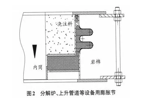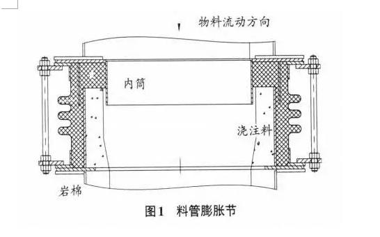 。由于料管上有起到通斷作用的鎖風(fēng)閥,熱風(fēng)被截?cái)?,物料是管道的介質(zhì)。因此,只要_膨脹節(jié)按照物料流動(dòng)方向安裝,內(nèi)部巖棉會(huì)受到很好的保護(hù),膨脹節(jié)很少失效。除此之外,還要注意內(nèi)筒下部跟澆注料之間的間隙控制,間隙太小會(huì)影響內(nèi)筒移動(dòng),引起膨脹節(jié)失效。間隙太大,對(duì)巖棉保護(hù)不利。
